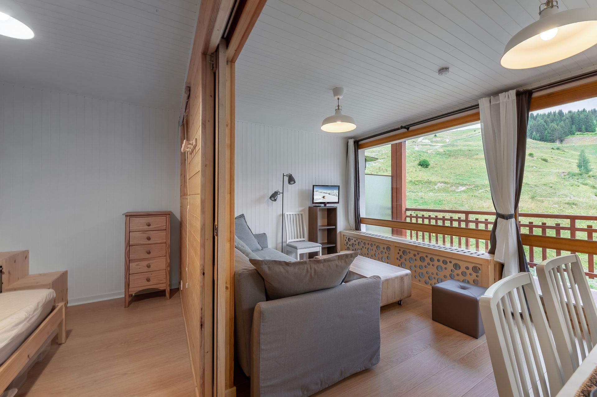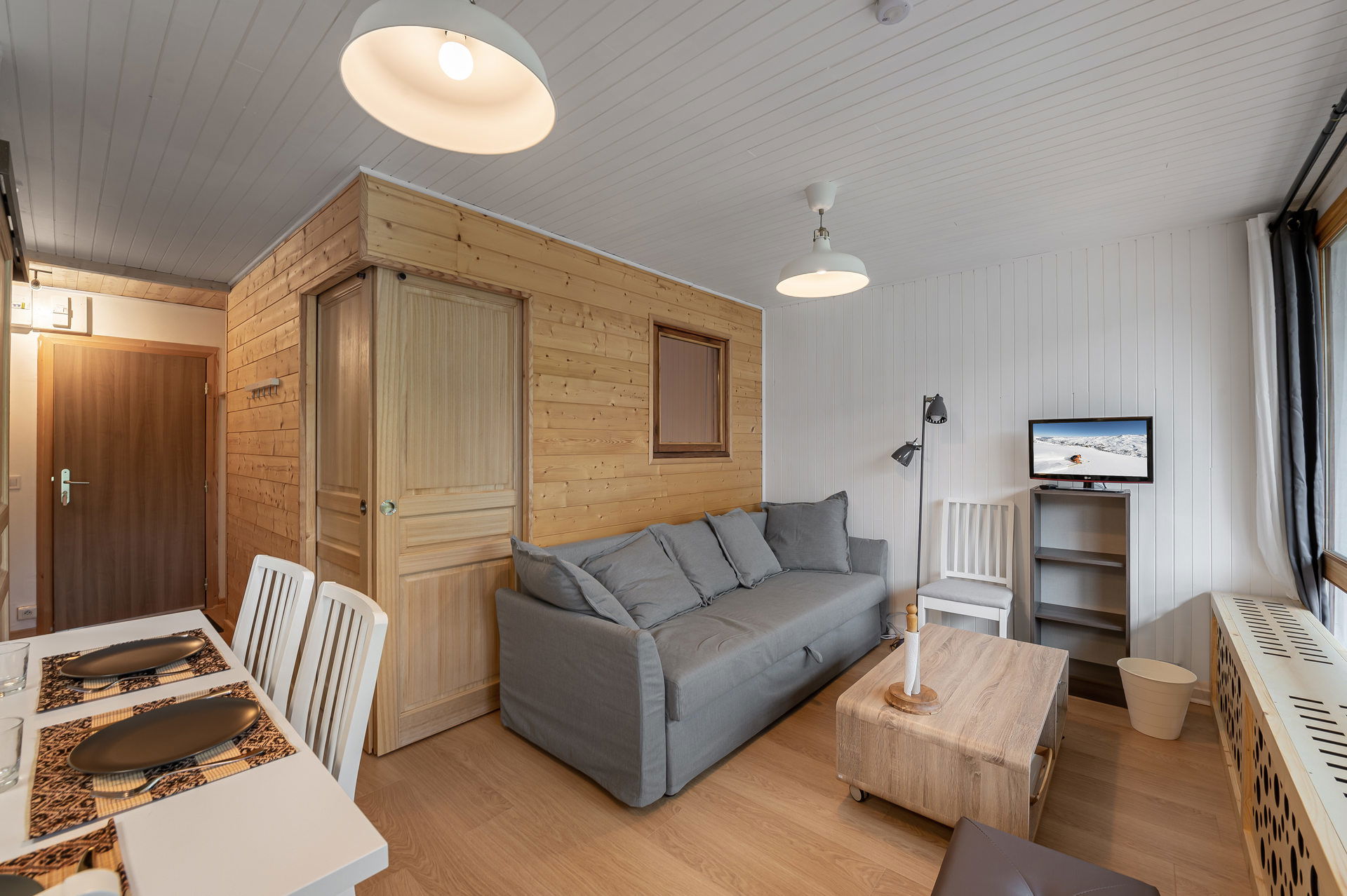 - Living room with a TV, a sofa bed