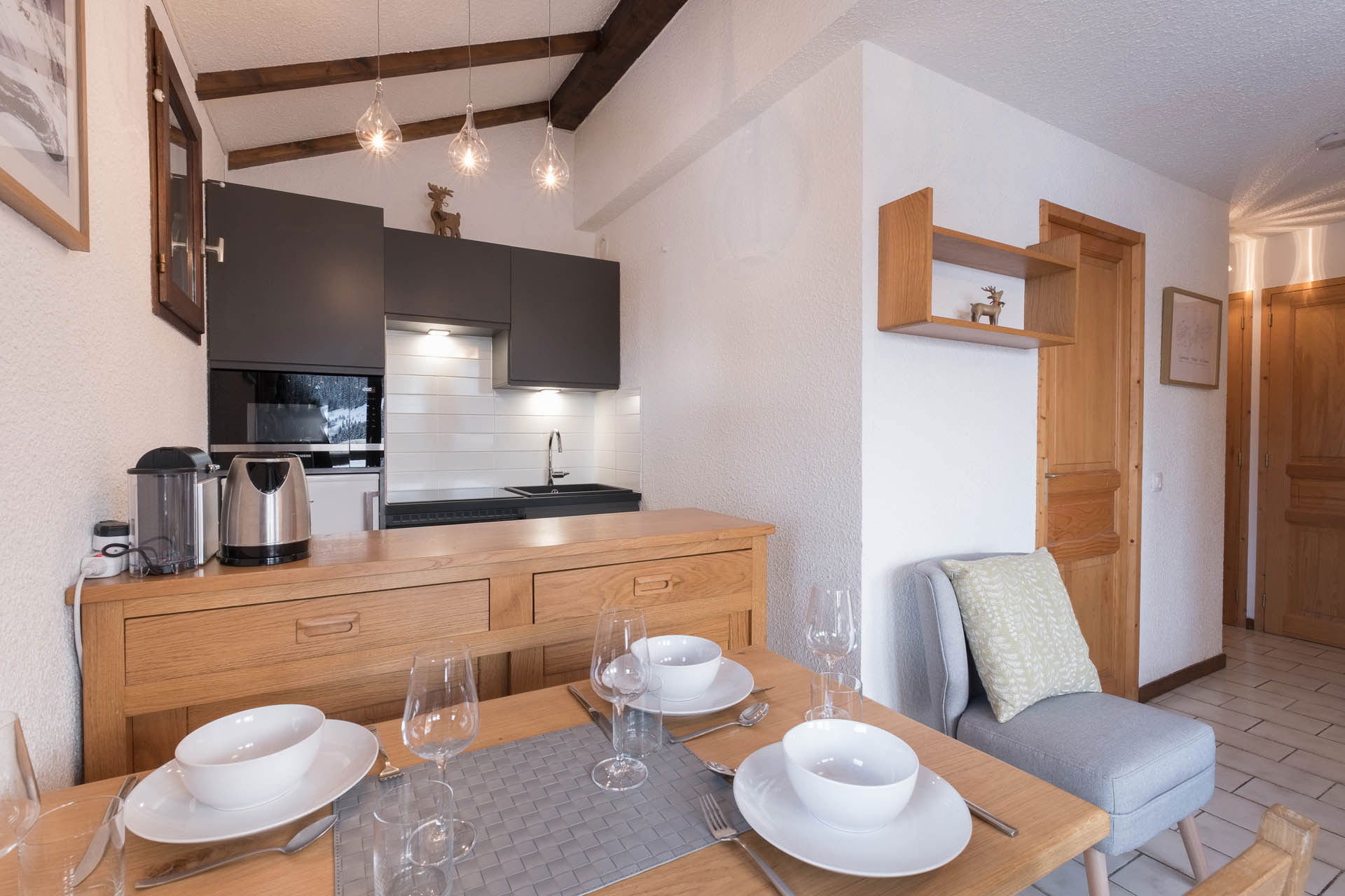 - Open kitchen equipped with oven, dishwasher, refrigerator, Nespresso coffee machine...