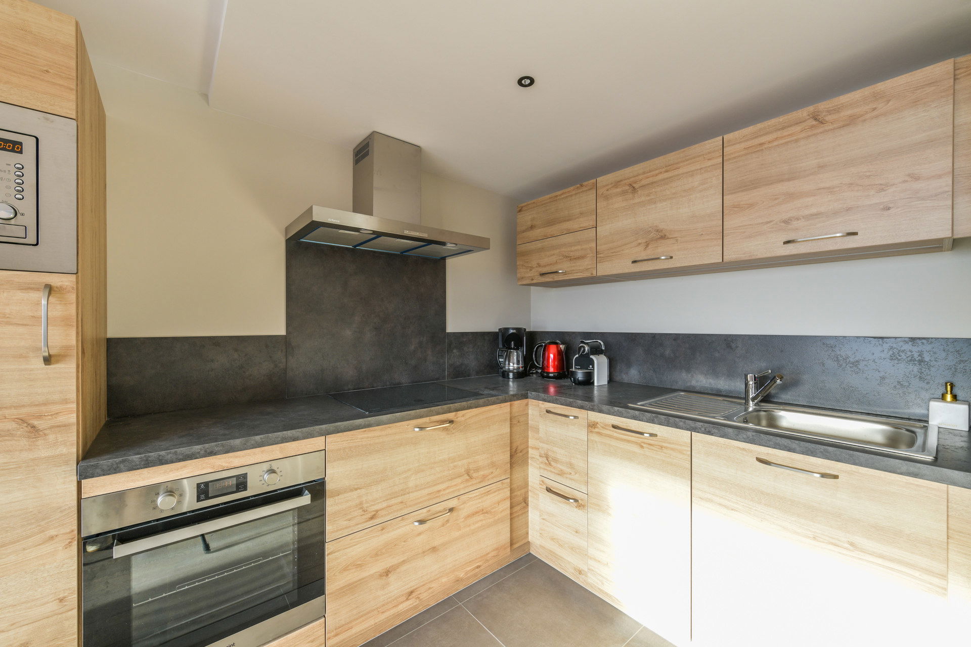 Open plan kitchen with dishwasher, fridge and freezer, vitroceramics hobs, microwave