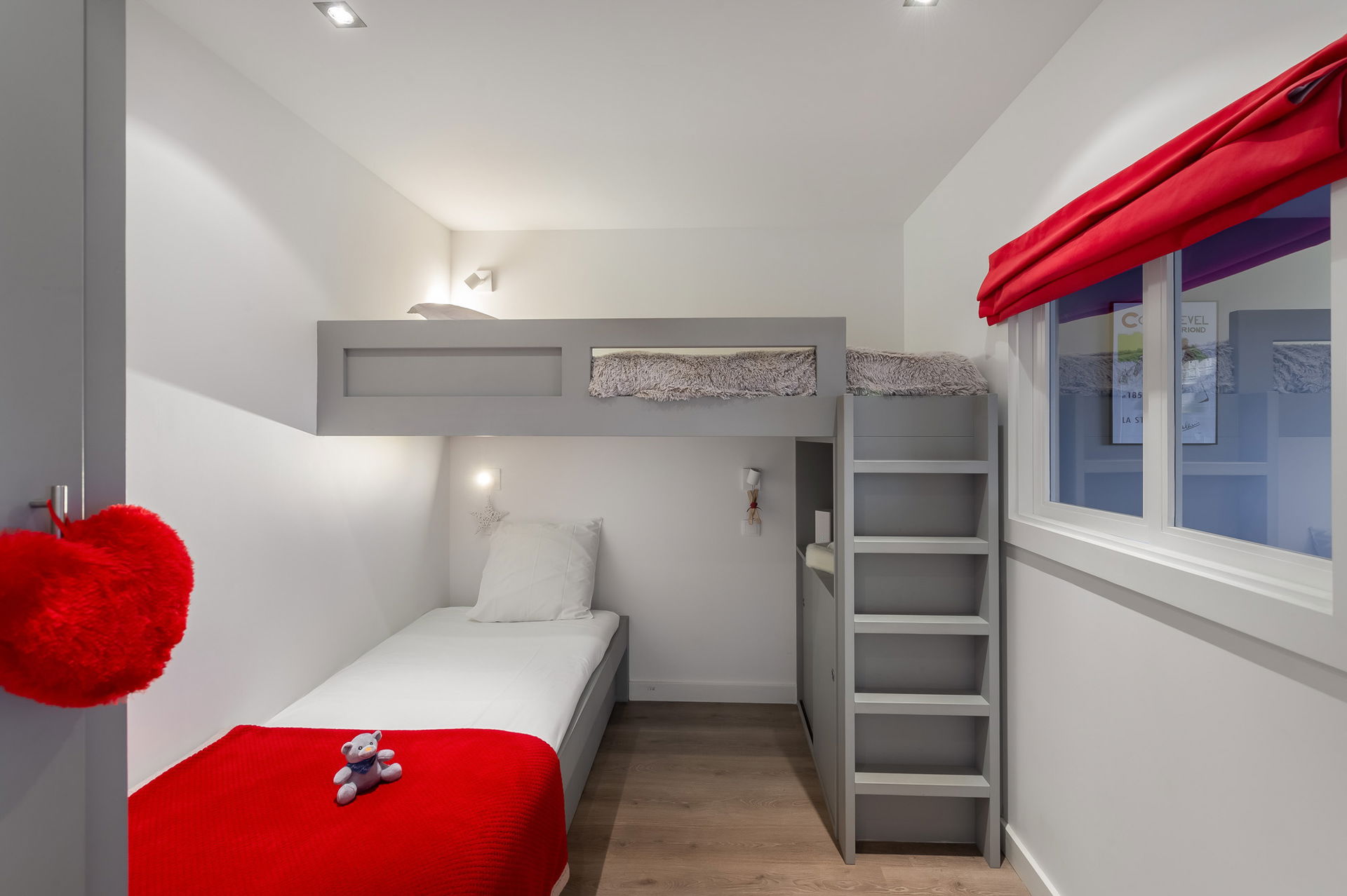 - A cabin bedroom with 2 single beds, one accesible with a ladder