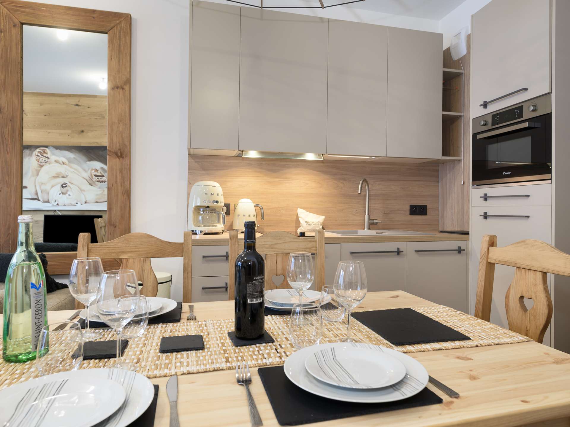 - A fully equipped kitchen open to the living room (dishwasher, kettle, oven, SMEG coffee maker etc...)
