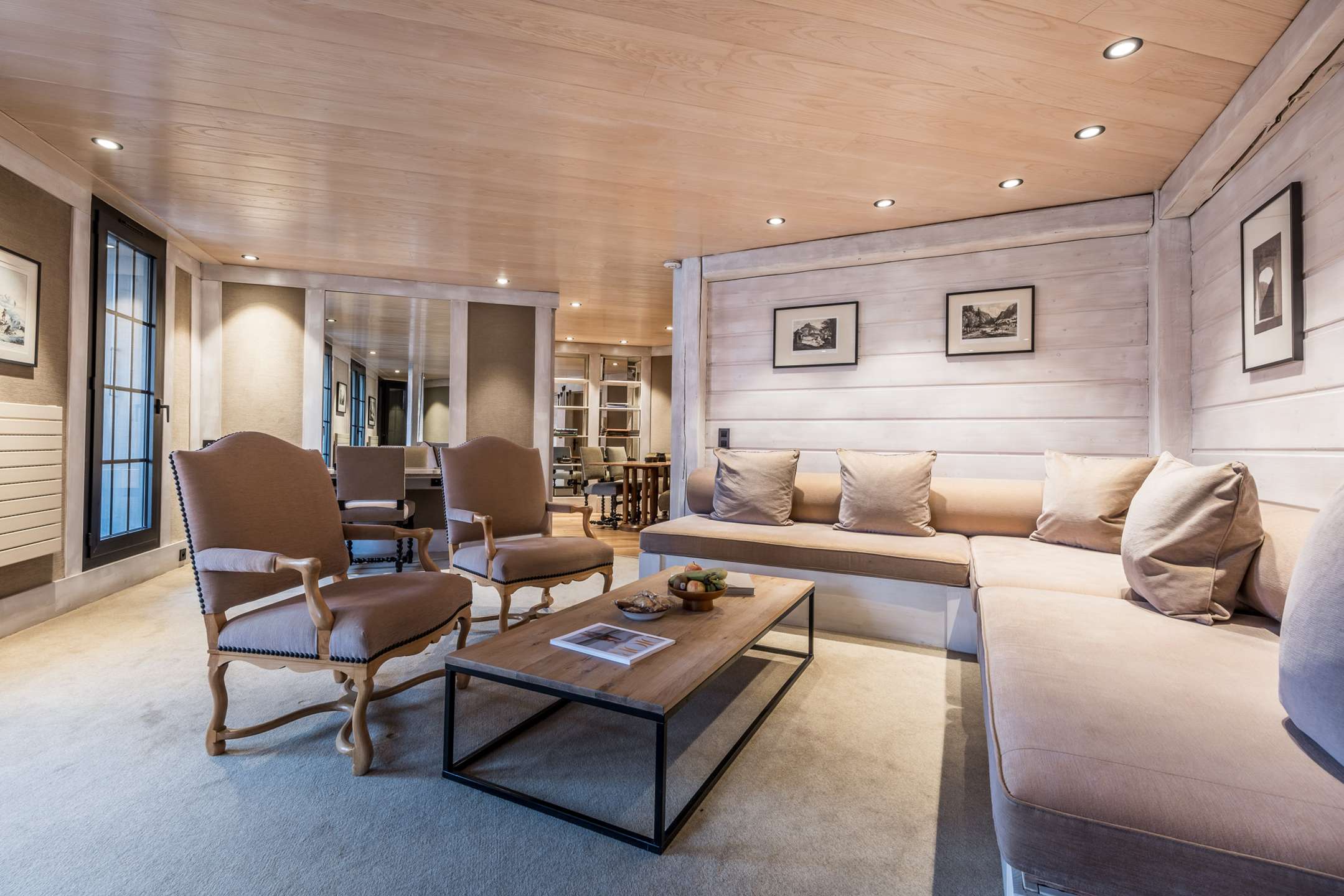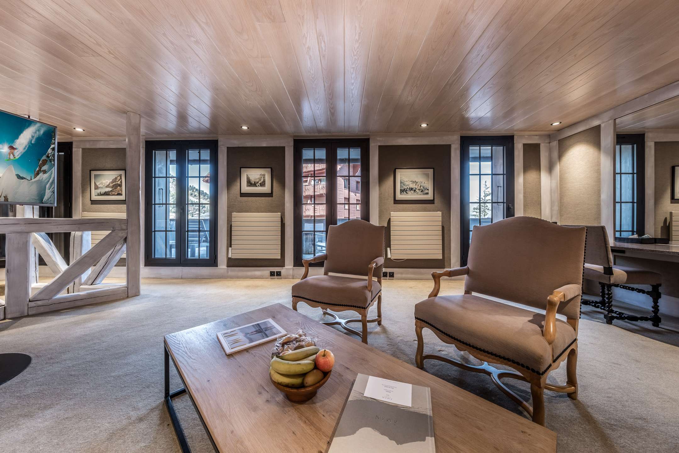 - A living room with desk, TV, lounge area, access to a large terrace with garden furniture and view on the slopes,