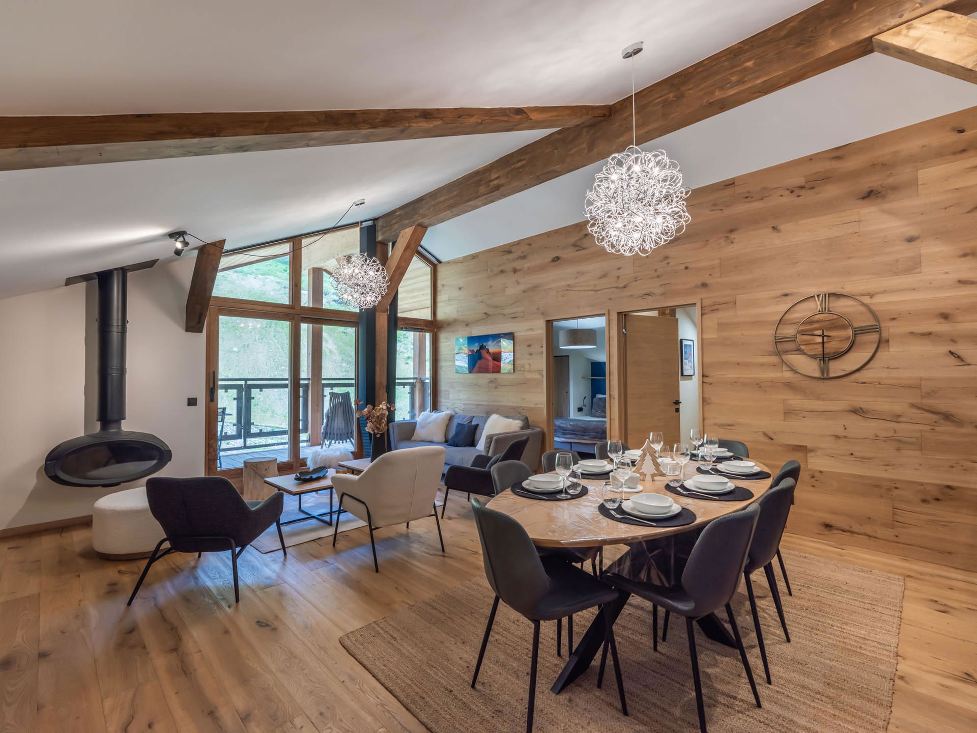 - Living room with TV, south-facing balcony, lounge and dining area, wood-burning fireplace