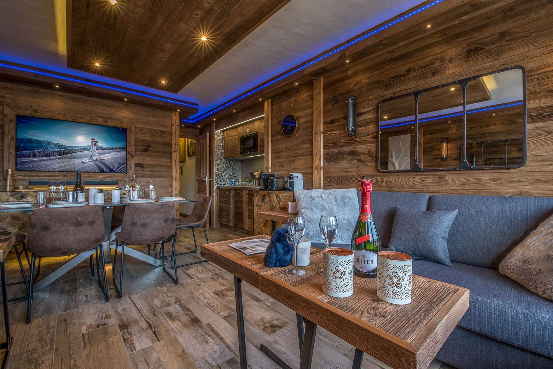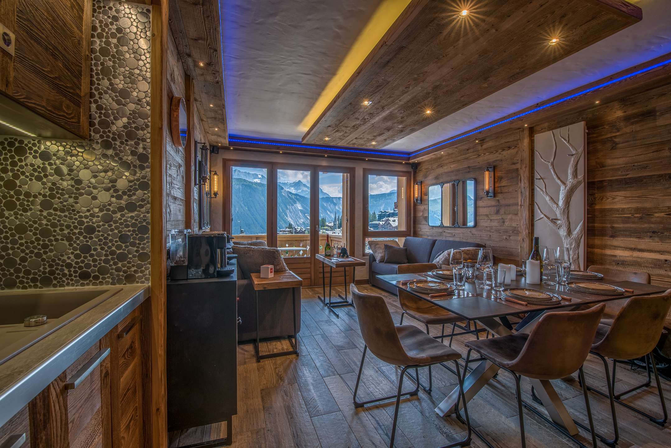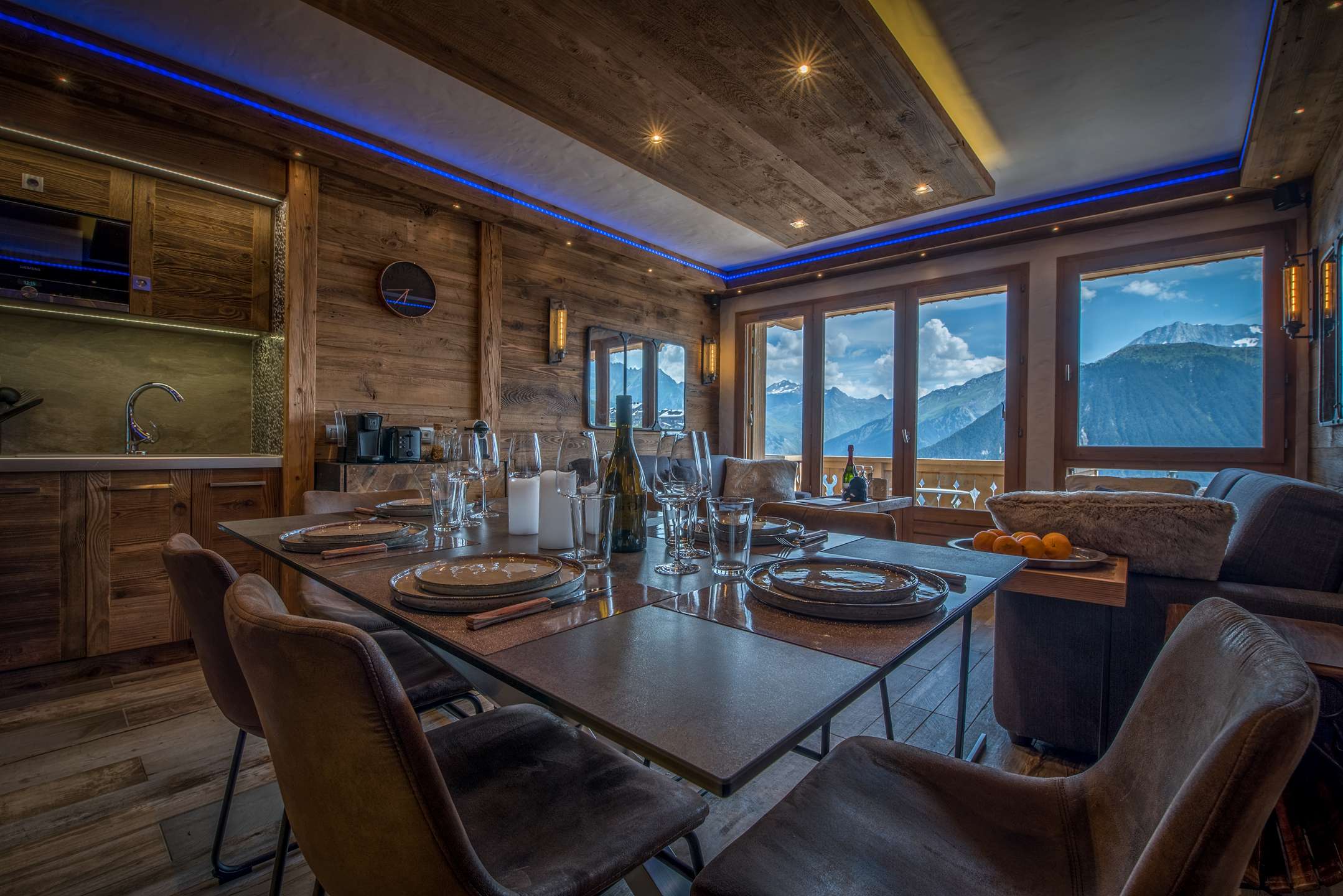 - A dining area and a lounge area on the mountain side