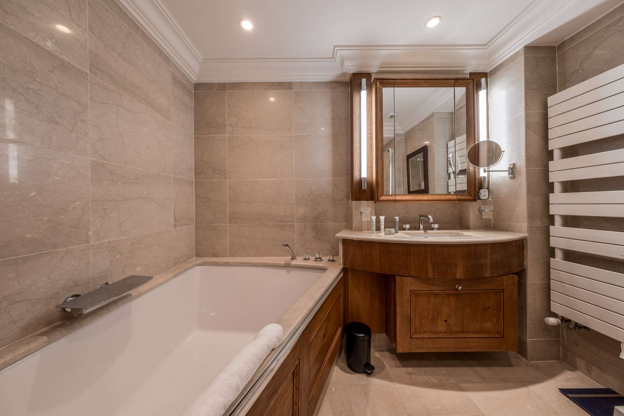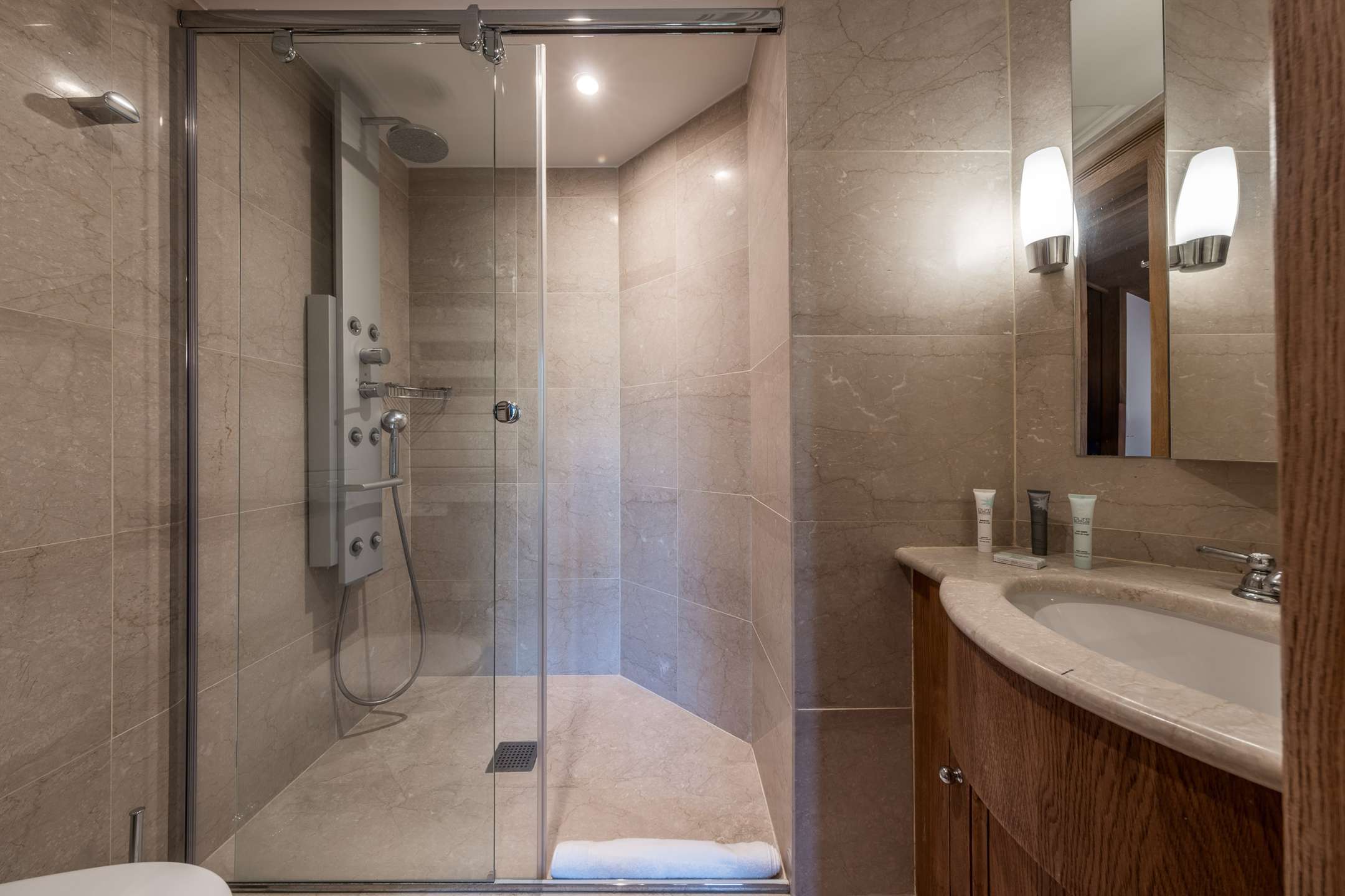 - One double bedroom (two 90x200 single beds) with access to the en-suite bathroom (bath, double washbasin and separate toilet)