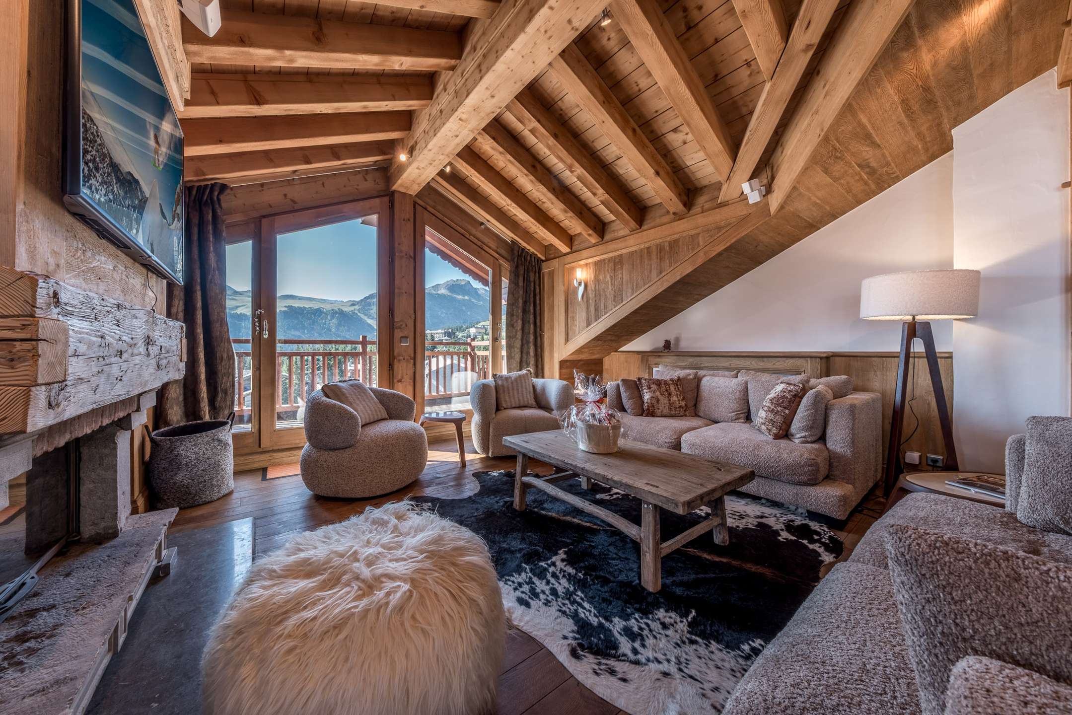 - A large living room with large bay windows offering breathtaking mountain views, access to the balcony, fireplace and a large flat-screen TV