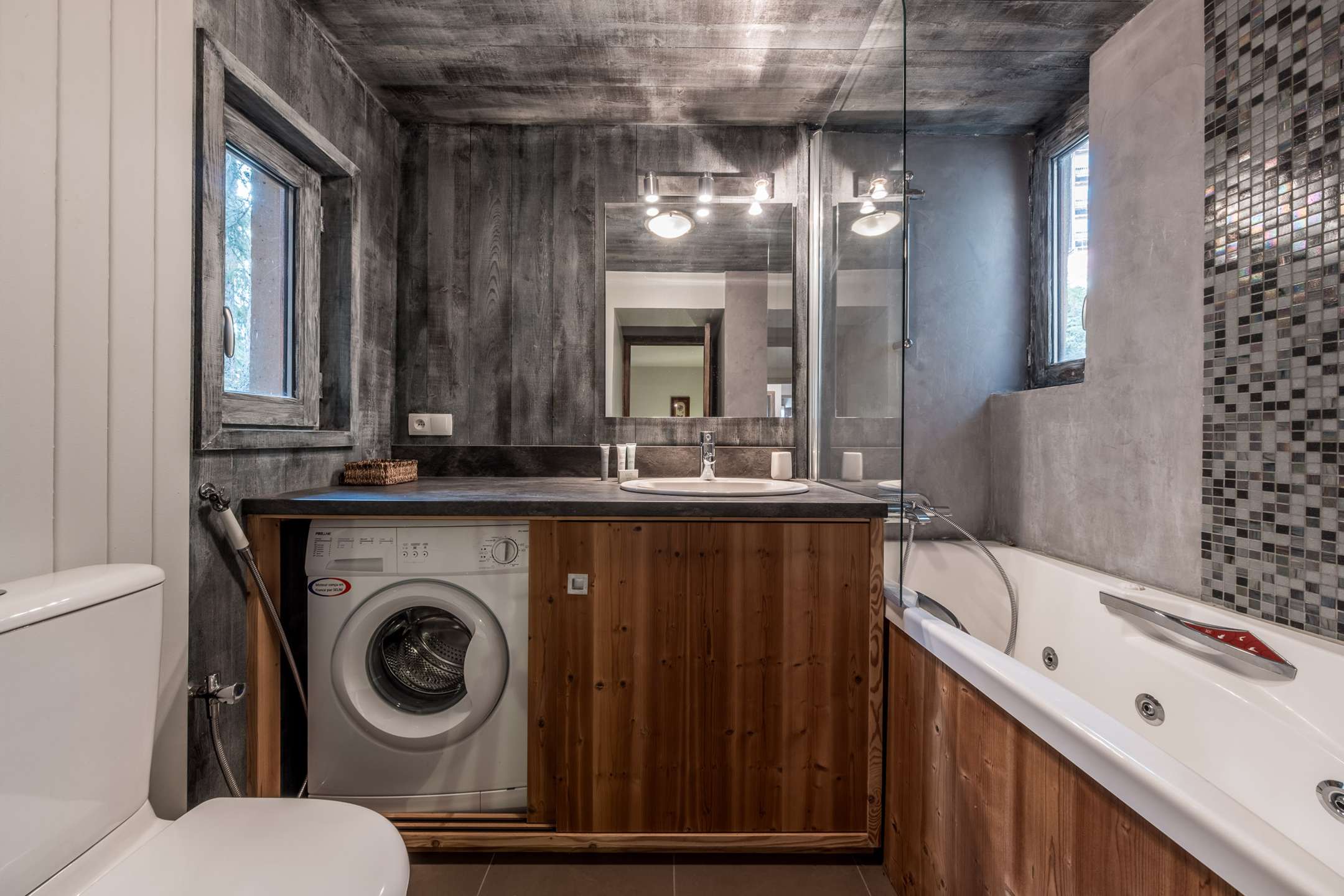 - A bedroom with a double bed (160x190), en-suite bathroom with a balnéo bathtub and shower, toilet, and washing machine