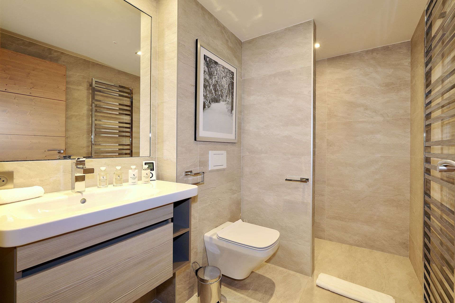 - Master bedroom (180*200) with TV, en suite with a bathroom: bathtub and shower, toilet, sink, and towel warmer.